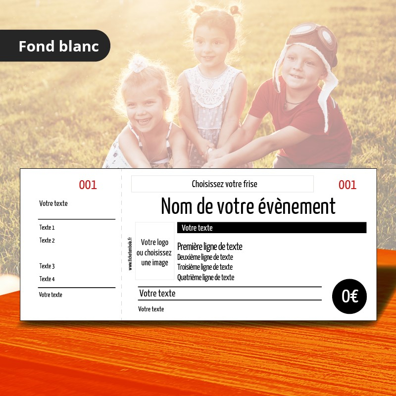 Personnalisez les tickets de votre futur évènement. Changez directement en ligne les textes (et leurs couleurs) que vous souhaitez inscrire : nom de l'établissement, infos souches et tickets, prix, logos... De plus, nous vous proposons des frises et des petites illustrations que vous pouvez importer gratuitement dans les emplacements prévus.