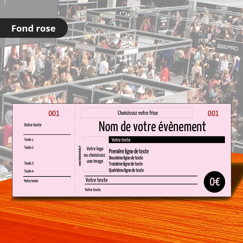 Personnalisez les tickets de votre futur évènement. Changez directement en ligne les textes (et leurs couleurs) que vous souhaitez inscrire : nom de l'établissement, infos souches et tickets, prix, logos... De plus, nous vous proposons des frises et des petites illustrations que vous pouvez importer gratuitement dans les emplacements prévus.